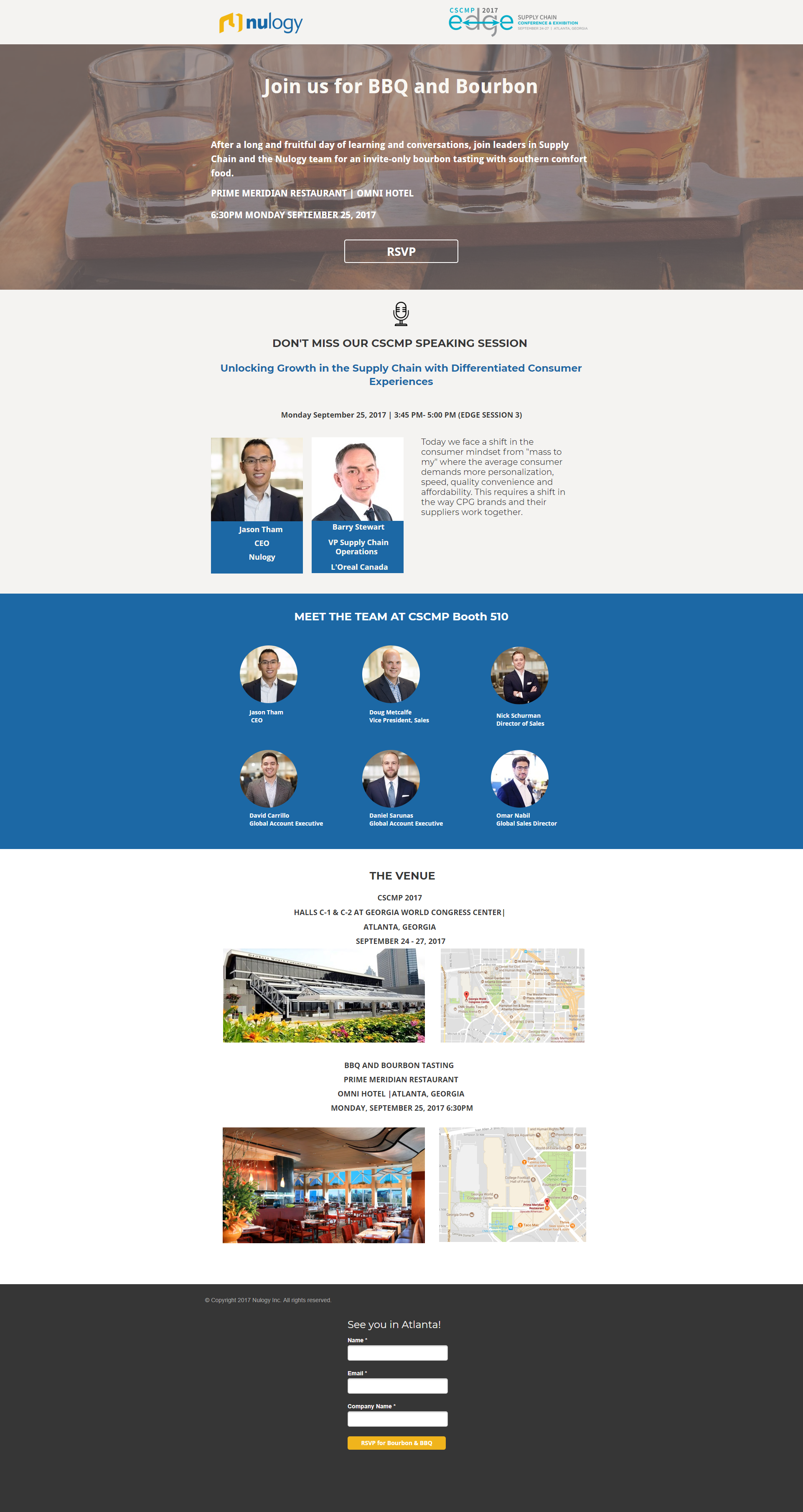 Nulogy is a supply chain SaaS company. Our team was sponsoring CSCMP, a major supply chain event, in Atlanta. I created a multi-touch campaign to re-engage dormant accounts and invite new prospects to attend a BBQ and bourbon tasting we were hosting. I created a multi-touch campaign including an email sequence, direct mail campaign, social media posts with a landing page so prospects can register. The event was a success with 40 VIPs attending and 50 qualified leads generated, and one opportunity estimated at $150K. Two accounts who couldn't make it to the conference, even requested a site visit.
